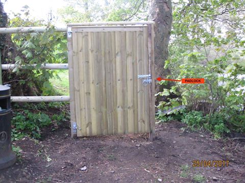 Please Note the Padlock is fitted to the rear of the Gate (see photo attached) so that you can lock it behind you. There is a hole cut in the Weld Mesh fence which now surrounds the Gate.