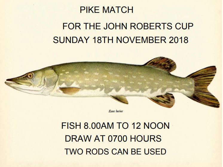 Pike Match for the John Roberts Cup will be held at Little Mill on Sunday 18th of November 2018 .