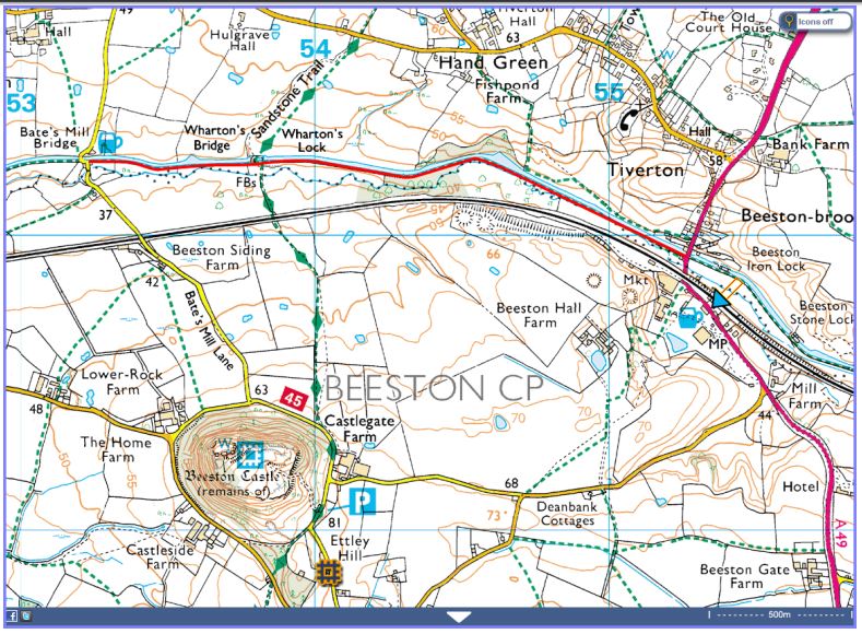 Heading west on the M56 take junction 10 and follow the A49 towards Whitchurch. Continue along the A49 through Cuddington, Sandiway and by passing Tarporley, arriving at Beeston shortly after the village of Tiverton. Parking is available in the Cafe car park just before the railway bridge but speak to the cafe owners first to confirm. The clubs stretch starts on the opposite side of the road and heads northwards.